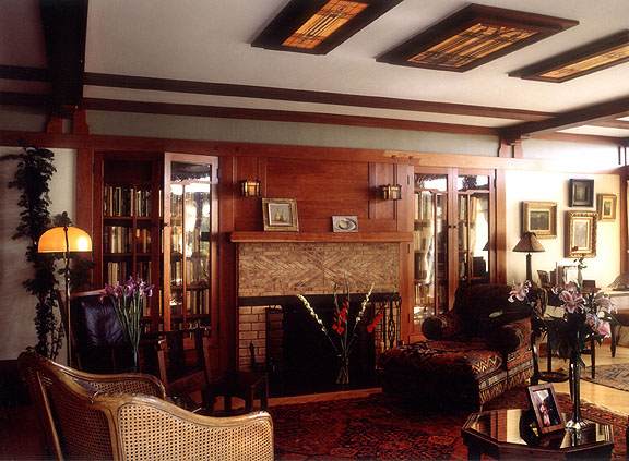 Fireplace masony and cabinets inspired by dining room of Casa Barranca,the Charles M. Pratt house, Ojai, California with elements of other Greene and Greene projects. In glazed brick, firebrick, steel, cherry and mahogany. Mantle light fixtures Frank Lloyd Wright reproductions by Buffalo Studios, while the ceiling skylights are original Frank Lloyd Wright stained glass from Chicago.