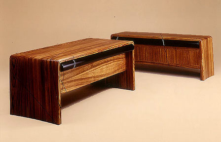 Zebrawood with ebony inlay and black & white lacquer details, (matching swivel leather chair not shown)