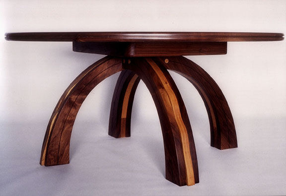Walnut and white oak. 60" Diameter extends with leaves to 96" long
