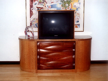 Lacewood solids and veneers with sculpted "strata" mahogany panel remote controlled lift mechanism